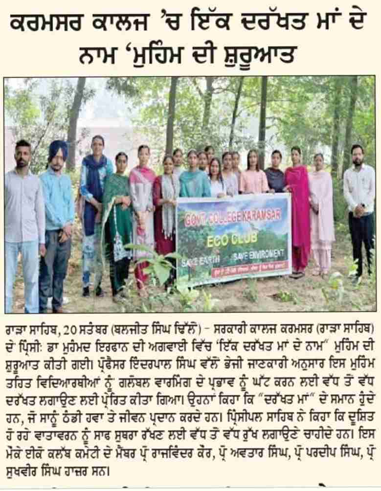 ਸਰਕਾਰੀ ਕਾਲਜ ਕਰਮਸਰ ਵਿੱਚ "ਇੱਕ ਦਰਖਤ ਮਾਂ ਦੇ ਨਾਮ" ਮੁਹਿੰਮ ਦੀ ਸ਼ੁਰੂਆਤ ਕੀਤੀ ਗਈ 17-09-2024