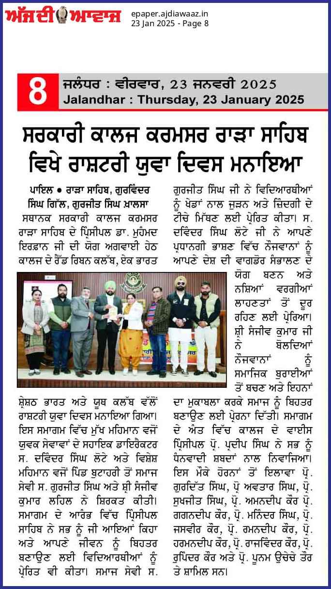 ਸਰਕਾਰੀ ਕਾਲਜ ਕਰਮਸਰ ਵਿੱਚ ਰਾਸ਼ਰੀ ਯੁਵਾ ਦਿਵਸ ਮਨਾਇਆ ਗਿਆ
