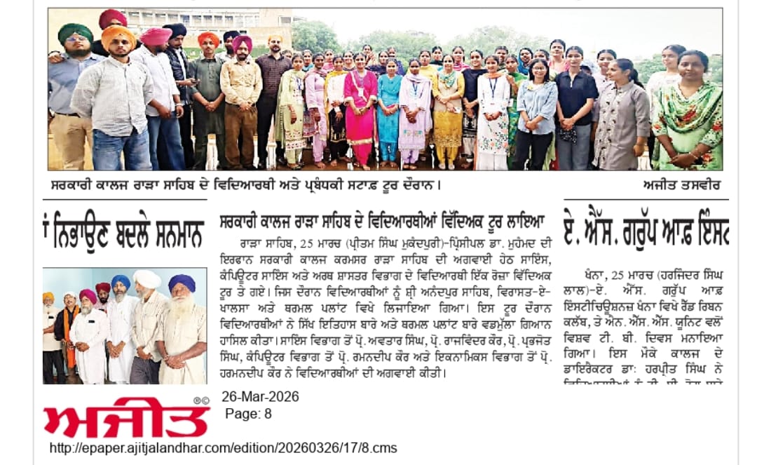 ਸਰਕਾਰੀ ਕਾਲਜ ਕਰਮਸਰ ਰਾੜਾ ਸਾਹਿਬ ਦੀ ਅਗਵਾਈ ਹੇਠ ਸਾਇੰਸ ਅਤੇ ਅਰਥ ਸ਼ਾਸਤਰ ਵਿਭਾਗ ਦੇ ਵਿਦਿਆਰਥੀਆਂ ਦਾ ਇੱਕ ਰੋਜ਼ਾ ਵਿੱਦਿਅਕ ਟੂਰ ਸ੍ਰੀ ਅਨੰਦਪੁਰ ਸਾਹਿਬ , ਵਿਰਾਸਤ-ਏ-ਖਾਲਸਾ ਅਤੇ ਥਰਮਲ ਪਲਾਂਟ ਵਿਖੇ ਲਜਾਇਆ ਗਿਆ