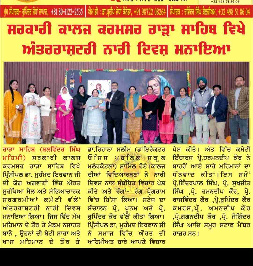 ਸਰਕਾਰੀ ਕਾਲਜ ਕਰਮਸਰ ਰਾੜਾ ਸਾਹਿਬ ਵਿਖੇ ਪ੍ਰਿੰਸੀਪਲ ਡਾ. ਮੁਹੰਮਦ ਇਰਫਾਨ ਦੀ ਅਗਵਾਈ ਹੇਠ 7 ਮਾਰਚ 2024 ਨੂੰ ਅੰਤਰਰਾਸ਼ਟਰੀ ਨਾਰੀ ਦਿਵਸ ਮਨਾਇਆ ਗਿਆ
