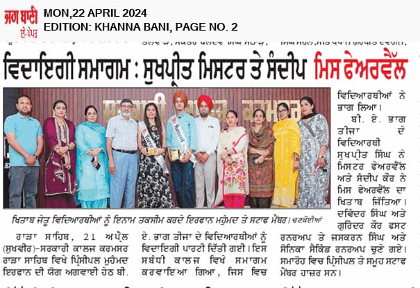 ਸਰਕਾਰੀ ਕਾਲਜ ਕਰਮਸਰ ਵਿੱਚ ਵਿਦਾਇਗੀ ਸਮਾਗਮ ਕਰਵਾਇਆ ਗਿਆ 15 ਅਪ੍ਰੈਲ 2024
