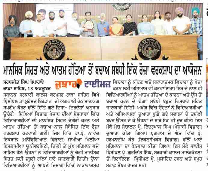 ਸਰਕਾਰੀ ਕਾਲਜ ਕਰਮਸਰ ਵਿੱਚ ਮਾਨਸਿਕ ਸਿਹਤ ਅਤੇ ਆਤਮ ਹੱਤਿਆ ਤੋਂ ਬਚਾਅ ਸਬੰਧੀ ਇੱਕ ਰੋਜ਼ਾ ਵਰਕਸ਼ਪ ਦਾ ਆਯੋਜਨ ਕੀਤਾ ਗਿਆ ਜਿਸ ਵਿੱਚ ਡਾਕਟਰ ਪ੍ਰੋਫੈਸਰ ਨਾਵੇਦ ਇਕਬਾਲ (ਮਨੋਵਿਗਿਆਨਿਕ ਵਿਭਾਗ) ਜਾਮੀਆ ਮਿਲੀਆ ਇਸਲਾਮੀਆ ਯੂਨੀਵਰਸਿਟੀ ਦਿੱਲੀ ਤੋ ਸ਼ਾਮਿਲ ਹੋਏ