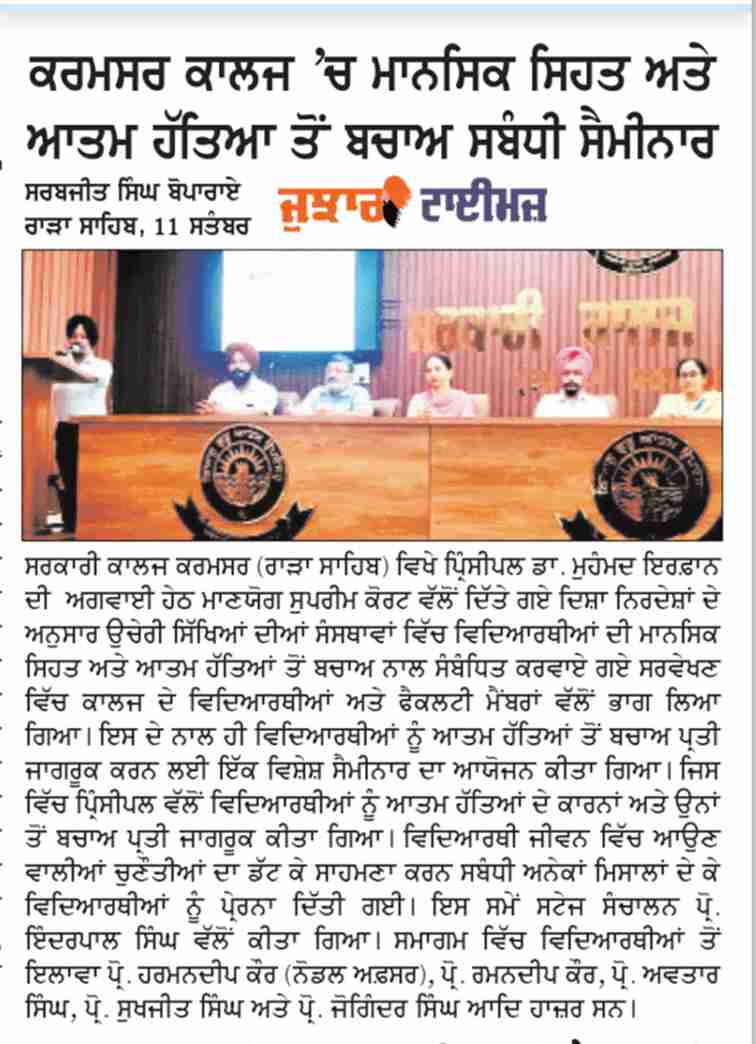 ਸਰਕਾਰੀ ਕਾਲਜ ਕਰਮਸਰ ਵਿੱਚ ਮਾਨਸਿਕ ਸਿਹਤ ਅਤੇ ਆਤਮ ਹੱਤਿਆ ਤੋਂ ਬਚਾਅ ਸਬੰਧੀ ਇੱਕ ਰੋਜ਼ਾ ਸੈਮੀਨਾਰ ਦਾ ਆਯੋਜਨ ਕੀਤਾ ਗਿਆ
