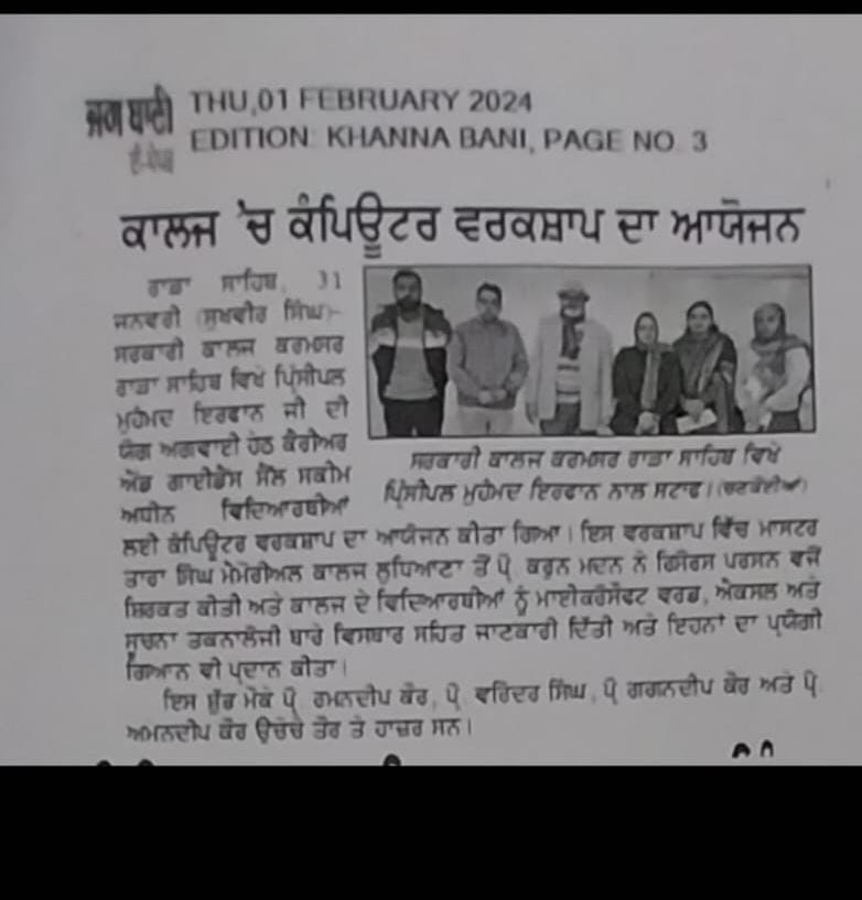 ਸਰਕਾਰੀ ਕਾਲਜ ਕਰਮਸਰ ਵਿੱਚ ਪ੍ਰਿੰਸੀਪਲ ਡਾ. ਮੁਹੰਮਦ ਇਰਫਾਨ ਜੀ ਦੀ ਅਗਵਾਈ ਹੇਠ 19 ਜਨਵਰੀ 2024 ਤੋਂ 25 ਜਨਵਰੀ 2024 ਤੱਕ ਕੰਪਿਊਟਰ ਦੀ ਇੱਕ ਵਰਕਸ਼ਾਪ ਆਯੋਜਿਤ ਕੀਤੀ ਗਈ