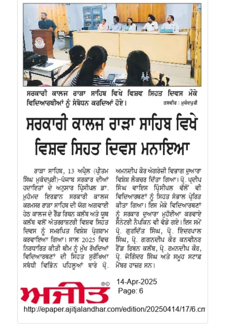 ਸਰਕਾਰੀ ਕਾਲਜ ਕਰਮਸਰ ਵਿੱਚ ਵਿਸਵ ਸਿਹਤ ਦਿਵਸ ਮਨਾਇਆ ਗਿਆ