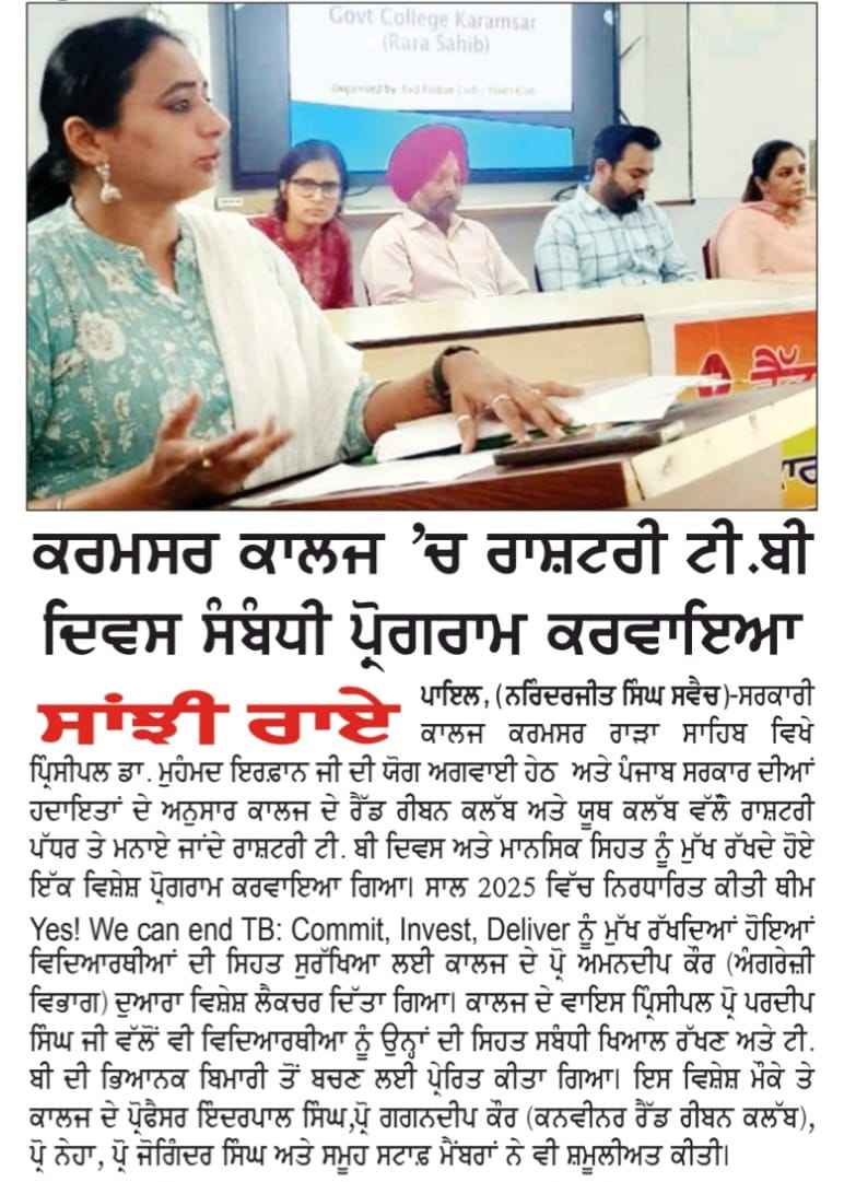 ਸਰਕਾਰੀ ਕਾਲਜ ਕਰਮਸਰ ਵਿੱਚ ਰਾਸ਼ਟਰੀ ਟੀ. ਬੀ ਦਿਵਸ ਮਨਇਆ ਗਿਆ