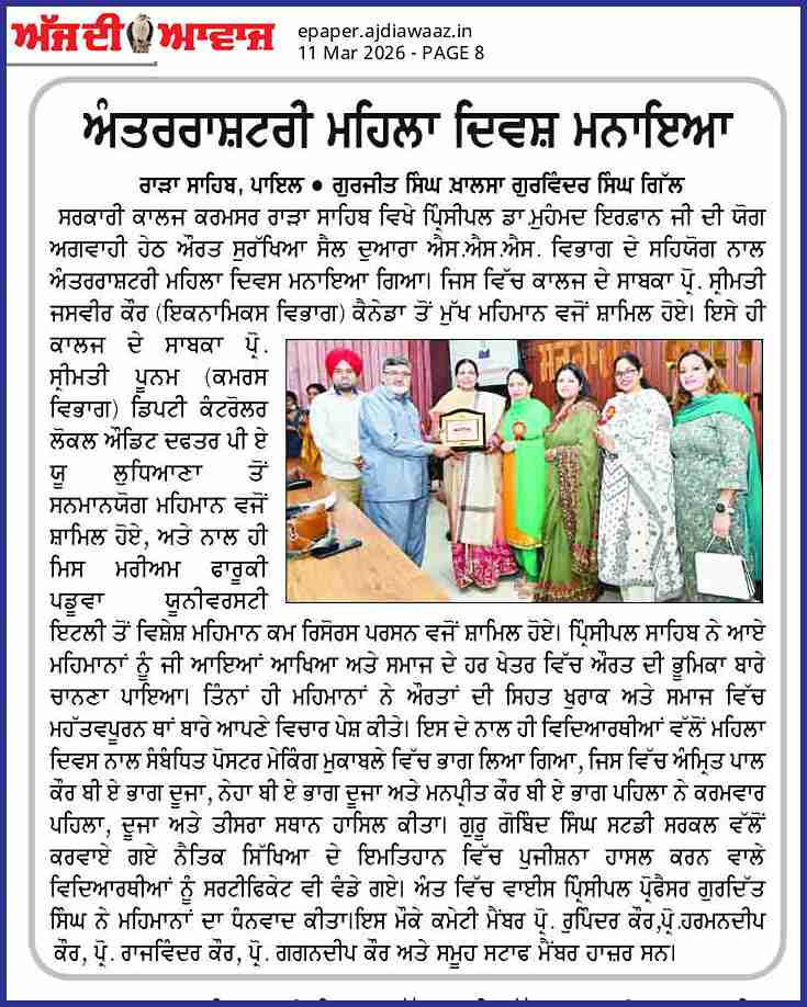 ਸਰਕਾਰੀ ਕਾਲਜ ਕਰਮਸਰ ਰਾੜਾ ਸਾਹਿਬ ਵਿਖੇ ਮਿਤੀ 09/03/26 ਨੂੰ ਅੰਤਰਰਾਸ਼ਟਰੀ ਮਹਿਲਾ ਦਿਵਸ ਮਨਾਇਆ ਗਿਆ, ਜਿਸ ਵਿੱਚ ਕਾਲਜ ਦੇ ਸਾਬਕਾ ਪ੍ਰੋ ਸ੍ਰੀਮਤੀ ਜਸਵੀਰ ਕੌਰ( ਇਕਨਾਮਿਕਸ ਵਿਭਾਗ) ਕੈਨੇਡਾ ਤੋਂ ਮੁੱਖ ਮਹਿਮਾਨ ਵਜੋਂ ਸ਼ਾਮਿਲ ਹੋਏ ਅਤੇ ਸਾਬਕਾ ਪ੍ਰੋ ਸ੍ਰੀਮਤੀ ਪੂਨਮ (ਕਮਰਸ ਵਿਭਾਗ) ਪੰਜਾਬ ਐਗਰੀਕਲਚਰ ਯੂਨੀਵਰਸਿਟੀ ਲੁਧਿਆਣਾ ਤੋਂ ਸਨਮਾਨਯੋਗ ਮਹਿਮਾਨ ਅਤੇ ਮਿਸ ਮਰੀਅਮ ਫਾਰੂਕੀ ਪਡੂਵਾ ਯੂਨੀਵਰਸਟੀ ਇਟਲੀ ਤੋਂ ਵਿਸ਼ੇਸ਼ ਮਹਿਮਾਨ ਕਮ ਰਿਸੋਰਸ ਪਰਸਨ ਵਜੋਂ ਸ਼ਾਮਿਲ ਹੋਏ।